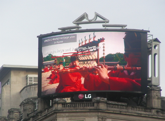 영국 런던 피커딜리 광장에서 상영되고 있는 ‘한국의 세계유산’ 영상. |