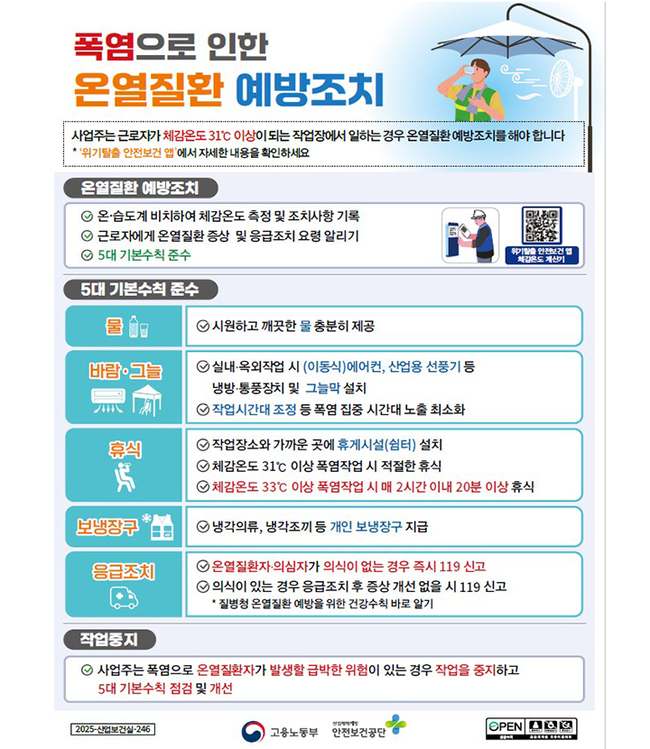 또한 시원한 물, 바람·그늘, 휴식, 보냉장구 지급, 응급조치 등 온열질환 예방 5대 기본수칙을 철저히 준수하고 휴게시설 설치, 체감온도 33°C 이상 폭염작업 시 매 2시간마다 20분 이상 휴식시간 부여 등 온열질환 예방에 만전을 기하도록 당부했다.