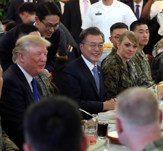 문재인 대통령이 국빈 방한한 도널드 트럼프 미국 대통령의 첫 일정인 평택 험프리즈 미군 기지에서 장병들과 오찬을 함께 하고 있다. <(c) 연합뉴스 제공> |