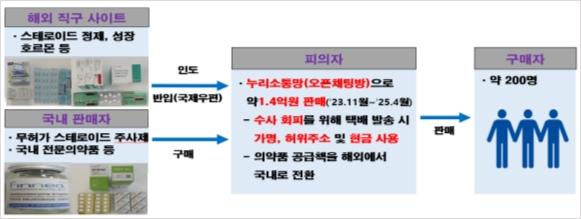 수사 결과, A씨는 과거 헬스트레이너로 일하던 시절 알게 된 해외직구 사이트를 활용하거나, 국내 무허가 제조·판매업자 B씨로부터 제품을 공급받아 판매한 것으로 확인됐다. 2023년 11월부터 올해 4월까지 A씨는 오픈채팅방을 운영하며 약 200명의 구매자에게 무허가 의약품을 택배로 판매했고, 복용법과 가격표까지 안내한 정황이 포착됐다.