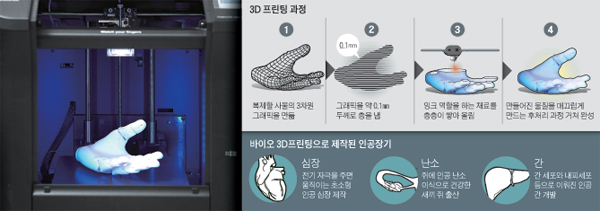 기존 3D-프린팅이 치과 보철, 의족 및 의수 등 신체를 지지하는 인공보철물의 제작에 그쳤다면, Bio-프린팅은 줄기세포를 이용하여 혈관, 안구, 간, 심장 등 체내이식물까지도 맞춤형으로 제작할 수 있는 길을 열어 줄 것으로 전망된다.
