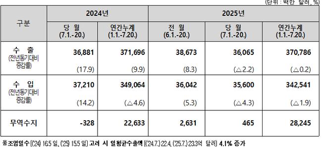 [일간환경연합 한선미 기자] 관세청이 21일 발표한 ‘2025년 7월 1~20일 수출입 현황’에 따르면, 해당 기간 수출은 361억 달러, 수입은 356억 달러로 집계됐다. 전년 동기 대비 수출은 2.2%(8.2억 달러), 수입은 4.3%(16.1억 달러) 각각 감소했지만, 무역수지는 5억 달러 흑자를 기록하며 전환에 성공했다.