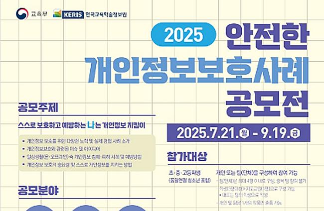 교육부와 한국교육학술정보원이 전국 초 · 중 · 고등학생과 대학생을 대상으로 `2025년 안전한 개인정보 보호 사례 공모전`을 개최한다.