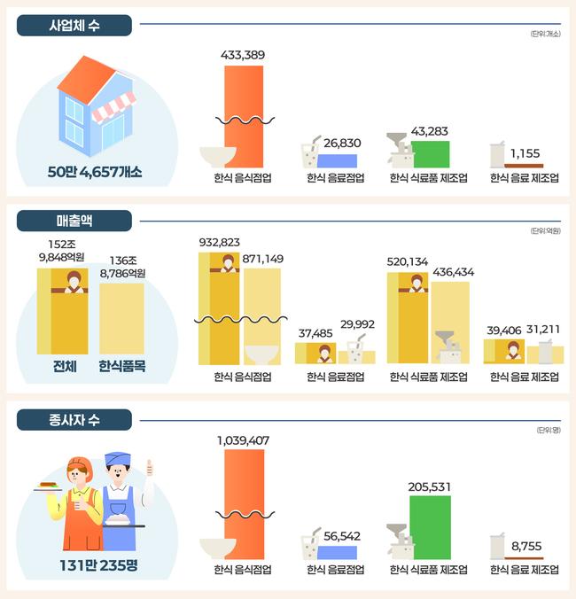 한식산업의 2023년 총매출액은 152조 9,848억 원으로 전년 대비 7.2% 증가했다. 이 중 외식업 매출은 97조 308억 원, 제조업은 55조 9,539억 원을 기록했으며, 전체 매출에서 한식 품목이 차지하는 비중은 각각 92.7%와 94.2%로 집계됐다.
