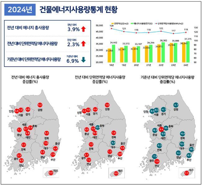 이번에 처음 공개된 원단위 기준에 따르면 2024년 공동주택의 경우 중부지역은 136kWh/㎡, 남부지역은 111kWh/㎡를 기록했다. 업무시설(사무소)은 각각 159kWh/㎡(중부), 102kWh/㎡(남부)로 집계돼 지역 간 차이를 보였다.