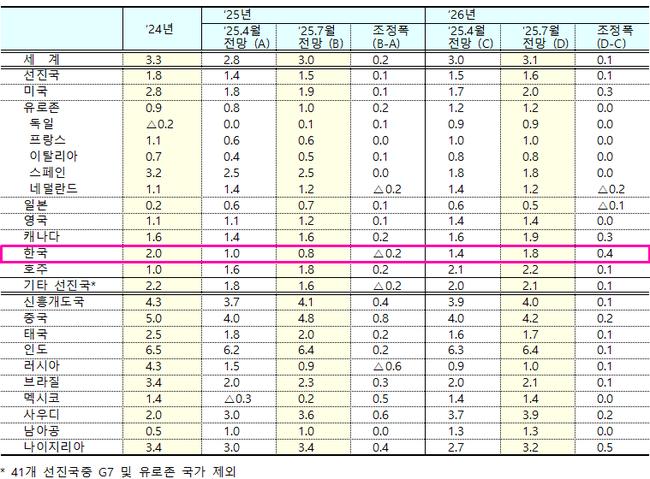 이는 지난 4월 전망(1.0%)보다 0.2%p 하향된 수치다. 반면 2026년 성장률은 기존 1.4%에서 1.8%로 0.4%p 대폭 상향됐다.