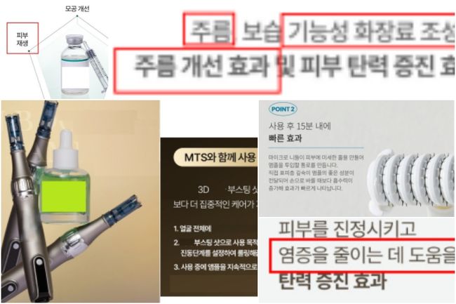 다음으로 `화장품 범위를 벗어나는 광고`가 25건(30%)으로, `MTS(마이크로니들 테라피 시스템)+화장품 판매 광고`, `MTS 기기와 함께 사용하면서 진피층 끝까지 침투`, `피부 내(진피층, 근막 등) 성분을 직접 전달` 등의 내용이 포함됐다.