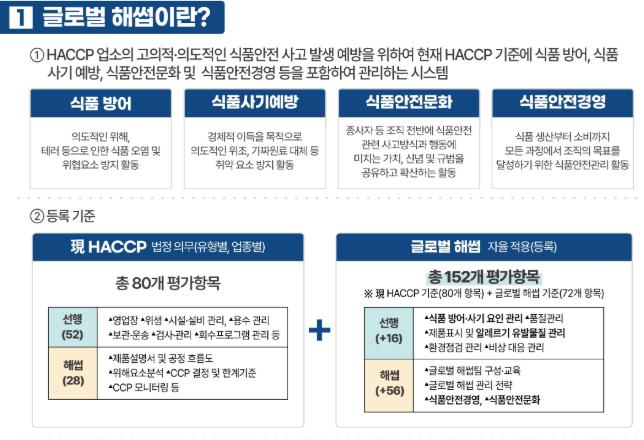 식약처는 국제식품안전협회(GFSI) 규격 인증 심사기관, 해썹 업체 등과 협의해 마련한 ‘글로벌 해썹 평가(심사) 매뉴얼’도 공개했다. 매뉴얼은 식약처 누리집(www.mfds.go.kr) 자료실에서 내려받을 수 있다.