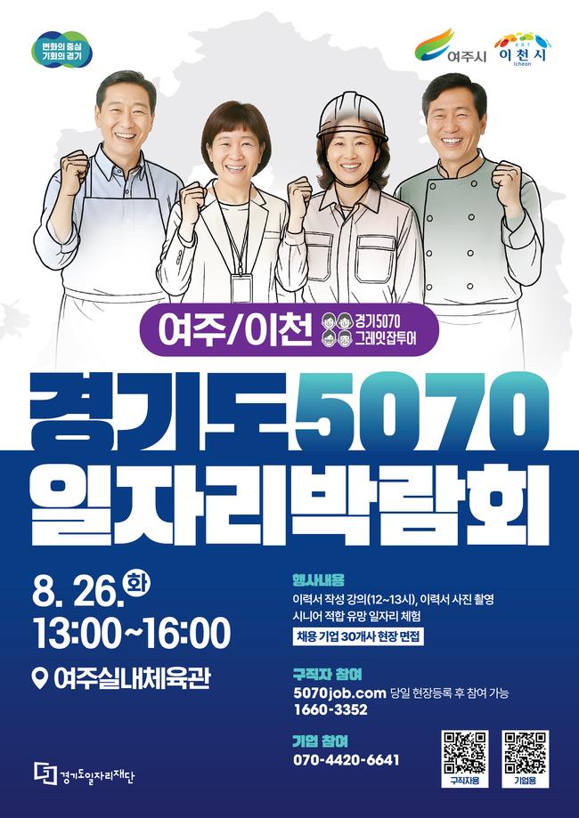 [일간환경연합 김경훈 기자] 경기도와 경기도일자리재단은 50~70대 중장년 구직자를 위해 여주실내체육관에서 ‘2025 경기도 5070 일자리박람회 in 여주·이천’을 개최한다.