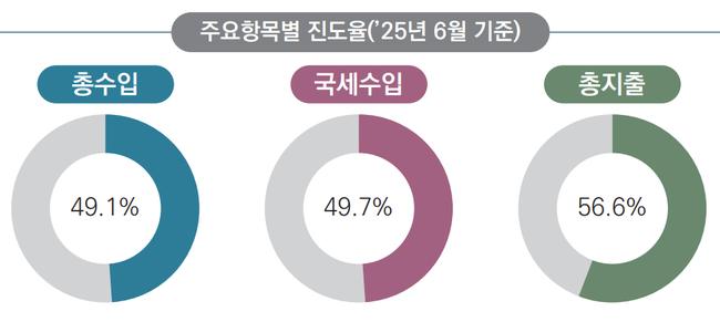 총지출은 일반회계 219.4조원, 특별회계 57.8조원, 기금 111.9조원으로 구성되며, 전체 진도율은 56.6%로 집계됐다. 기금 지출은 전년보다 2.4조원 증가했다.