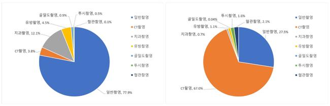 세부적으로는 일반촬영이 전년 대비 1,355만 건 늘었고, 치과촬영도 358만 건 증가했다. 반면, 유방촬영은 273만 건, CT는 8만 건, 투시촬영은 63만 건 줄었다.