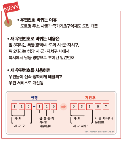 2014년 1월 1일 도로명 주소 시행과 더불어 국가기초구역제도가 도입돼 국가기초구역에 부여된 5자리 국가기초구역번호를 새 우편번호로 사용하게 된 것. 그렇다면 새로 바뀐 우편번호를 사용하면 어떤 점이 좋아질까?