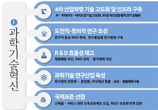 또한 국내총생산(GDP) 대비 연구개발(R&D) 투자비중은 증가하지만, 기술무역 수지는 정체상태인 점을 지적하며 “과학기술혁신은 4차 산업혁명 기술 고도화 및 인프라 구축, 도전적 창의적 연구 조성, R&D 효율성 제고, 과학기술 연구산업 육성, 국제표준 선점 등 5가지 큰 방향으로 해야한다”고 강조했다.