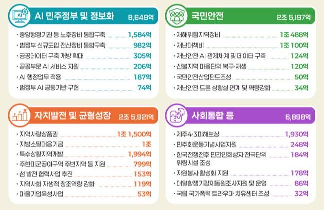 이번 예산은 이재명 정부 출범 후 첫 행안부 예산으로, ▲세계 최고 수준의 AI 민주정부 구현 ▲국민 안전 확보 ▲자치발전 및 균형성장 촉진 ▲사회통합과 과거사 해결 등 정부 핵심 과제의 이행에 중점을 뒀다. 사업비는 △AI 민주정부 및 정보화 8,649억 원 △국민 안전 2조 5,197억 원 △자치발전·균형성장 2조 5,921억 원 △사회통합 등 6,898억 원으로 배분됐다.