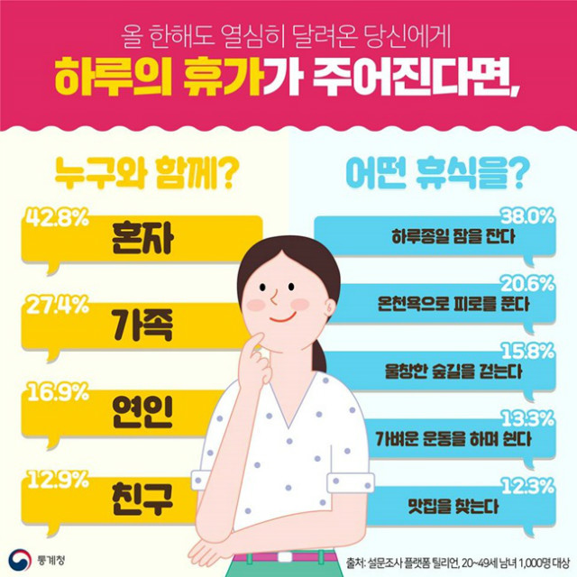 최근 설문조사 플랫폼 틸리언을 통해 20~49세 남녀 1,000명에게 ‘당신에게 하루의 휴가가 주어진다면 어떤 휴식을 선택하겠느냐’는 물음에 ‘하루 종일 잠을 자겠다’(38%)는 응답이 가장 많았습니다. 다음으로는 ‘온천욕으로 피로 풀기’(20.6%), ‘울창한 숲길 걷기’(15.8%), ‘가벼운 운동’(13.3%) 차례였습니다.
