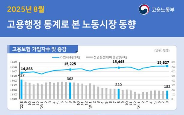 [일간환경연합 김경훈 기자] 고용보험 상시가입자가 8월 기준 1,562만 7천명으로 집계되며 전년 같은 달보다 18만 2천명(1.2%) 증가했다. 증가 폭은 올해 4월부터 5개월 연속 18만명대를 이어가며 완만한 회복세를 보이고 있다.