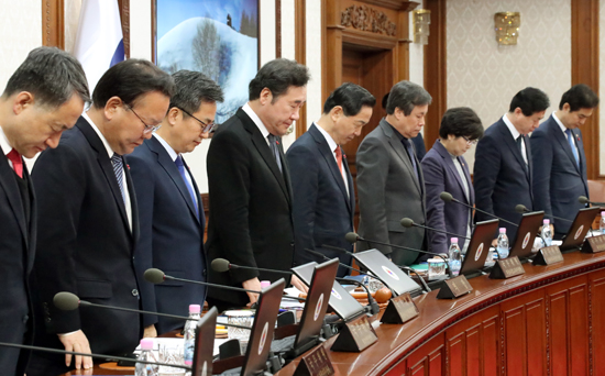 이낙연 총리와 국무위원들이 5일 국무회의에서 인천 영흥도 낚싯배 사고 희생자들을 위한 묵념을 하고 있다. |