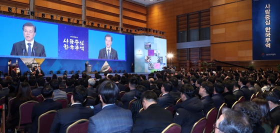 문재인 대통령이 5일 오전 서울 강남구 코엑스에서 열린 제54회 무역의 날 기념식에서 축사하고 있다. (사진=연합뉴스 제공) |