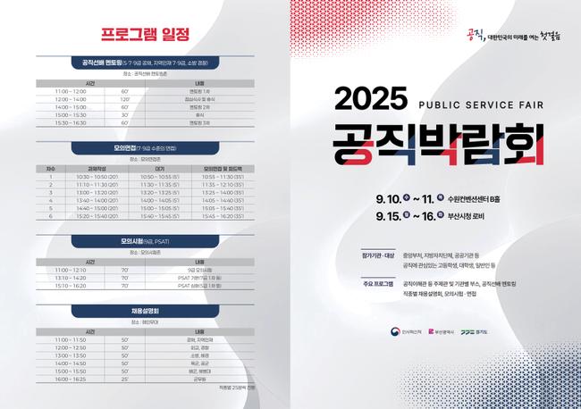[일간환경연합 김경훈 기자] 올해 공직 채용정보를 총망라한 ‘2025 공직박람회’가 수원과 부산에서 잇달아 열린다. 인사혁신처(처장 최동석)는 10일 수원컨벤션센터에서 개막해 11일까지 이어지며, 이어 15~16일에는 부산시청에서 개최된다고 밝혔다.