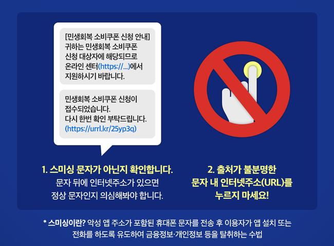 [일간환경연합 장민주 기자] 정부가 2차 민생회복 소비쿠폰 신청·지급을 앞두고 정부나 금융기관을 사칭한 스미싱 문자 메시지에 대한 각별한 주의를 당부했다.