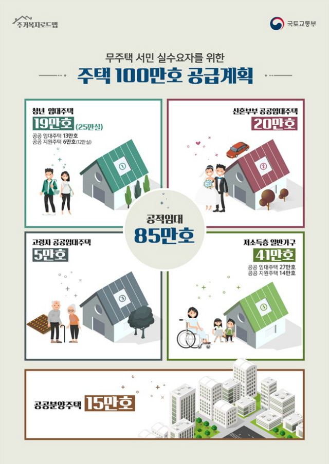 [일간환경연합 신상미 기자]정부는 앞으로 5년간 공적임대주택 85만 가구와 공공분양 15만 가구 등 총 100만 가구의 주택을 공급해 무주택 서민에게 주거사다리를 마련, 계층 간 사회통합을 추진하는 ‘주거복지로드맵’을 발표했습니다.