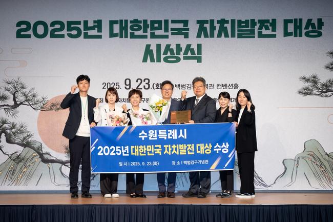[일간환경연합 김경훈 기자] 수원특례시(시장 이재준)가 (사)한국자치발전연구원 주관 `2025년 대한민국 자치발전대상`에서 기초자치 부문 대상을 받았다. 시상식은 23일 백범김구기념관 컨벤션홀에서 열렸다.