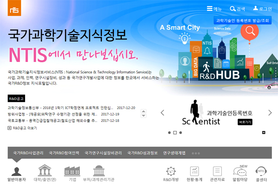 국가과학기술지식정보서비스(NTIS) 누리집(www.ntis.go.kr) 메인화면.