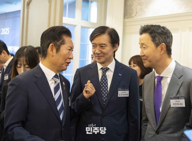 정청래 당대표가 2025.10.23.(목) 영등포구 여의도에 위치한 CCMM빌딩에서 열린 2025 국민미래포럼에 참석하여 기념촬영을 하고 있다.
