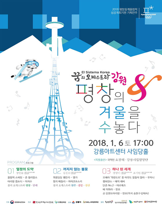 먼저 꿈의 오케스트라 평창·인제 연합팀이 ‘열정의 도약’을 주제로 존 윌리엄스의 ‘올림픽 스피릿’과 이지수의 ‘아리랑랩소디’를 선보인다. 꿈의 오케스트라 원주·강릉·정선 연합팀은 ‘꺼지지 않는 불꽃’을 주제로 엘가의 ‘위풍당당 행진곡’, 차이콥스키의 명곡 메들리를 들려준다.