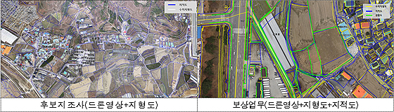 토지보상의 경우 사업초기단계에 항공사진을 일회성으로 촬영·활용하고 직접방문조사를 병행하던 방식을 수시 확보되는 드론 영상과 지적도·지형도 간 중첩·비교하는 방식으로 대체한다.