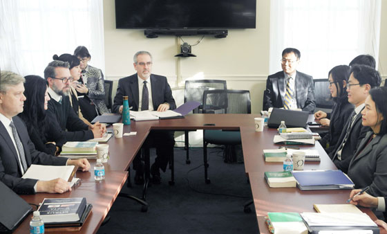 5일 미국 무역대표부 회의실에서 유명희 산업통상자원부 통상정책국장(수석대표)을 비롯한 한미 양국 정부대표단이 참석한 가운데 ‘한미FTA 1차 개정 협상’을 하고 있다. (사진=산업통상자원부) |
