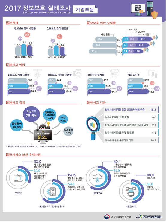 과학기술정보통신부는 종사자 1인 이상 9000개 기업과 개인 4000명을 대상으로 한 2017년 정보보호 실태조사 결과를 발표했다.
