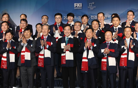 이낙연 국무총리가 10일 낮 서울 여의도 전경련회관에서 열린 평창동계올림픽대회 및 동계페럴림픽대회 성공을 위한 후원기업 신년다짐회에서 허창수 전경련 회장 등과 평창올림픽 목도리를 하고 기념촬영을 하고 있다.(사진=(c) 연합뉴스) |
