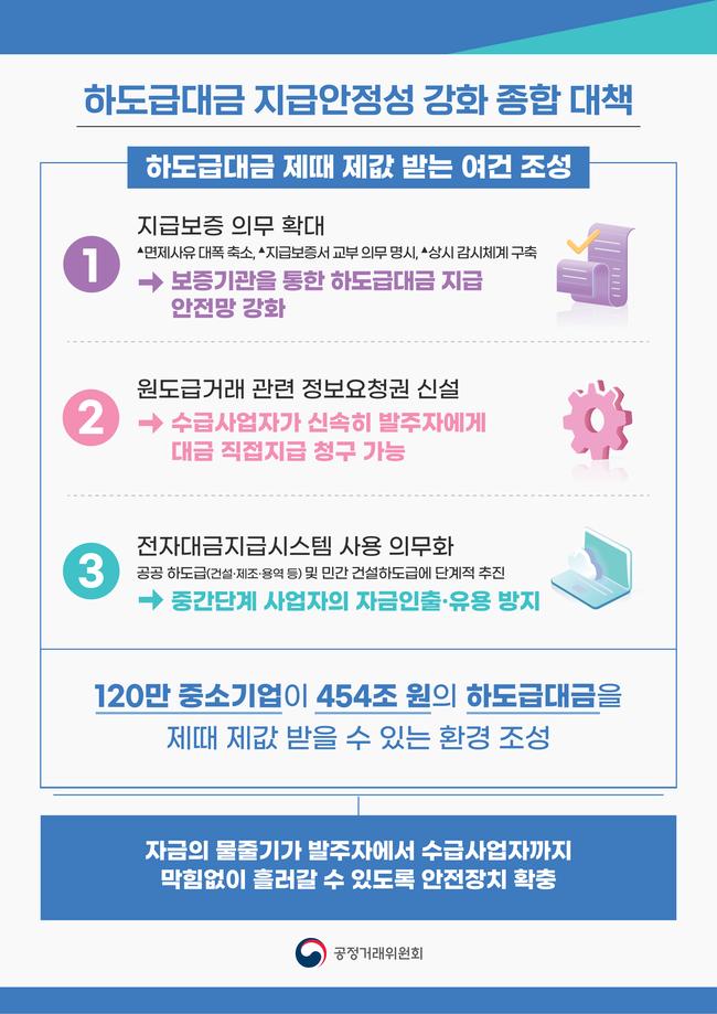 공공 분야의 ‘하도급지킴이’, ‘상생결제시스템’, 민간의 ‘클린페이’ 등이 대표적이며, 공정위는 국토교통부 등 관계기관과 협의해 시스템 개선 후 의무화를 추진한다.