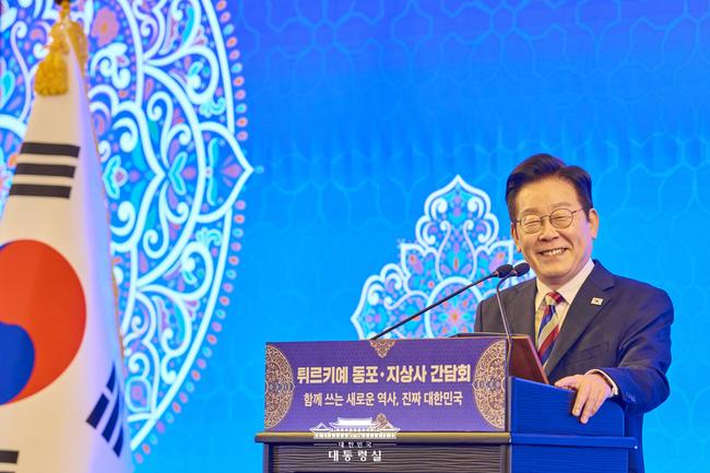 튀르키예를 국빈 방문 중인 이재명 대통령이 25일(현지시간) 앙카라의 한 호텔에서 열린 동포 · 지상사 간담회에서 발언하고 있다.