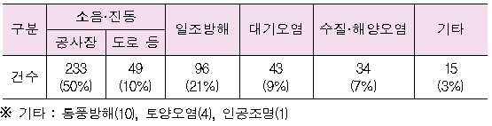 이 중 공사장 소음·진동으로 인한 농어업 피해는 233건으로 약 50%를 차지했다.
