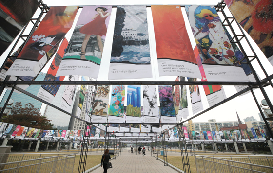 지난해 11월2일 서울 송파구 올림픽공원 평화의문 일대에서 열린 ‘2018 평창문화올림픽 아트배너전-올 커넥티드’에서 시민들이 작품을 감상하고 있다. 전시 작품들은 시각미술가들의 작품 2018점에 국민 공모로 선정된 2018개의 평창올림픽 응원 문구를 담은 깃발 형태로 제작됐다. (사진=(c) 연합뉴스)
