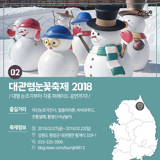 다음 달 7일부터 22일까지 강원도 평창군 대관령면 횡계리에서 대관령 눈꽃축제가 열립니다. 야간 눈 조각 전시, 얼음 마라톤, 바비큐 푸드, 전통썰매, 황병산 사냥놀이 등 대형 눈 조각부터 각종 퍼레이드 공연까지 다양한 체험이 기다리고 있어요.