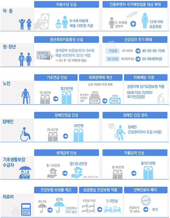 이를 위해 소득 하위 90% 이하 가구의 아동에게 월 10만원의 아동수당을 지급하고 기초생활보장 부양의무자 기준 폐지도 차질 없이 이행하기로 했다.