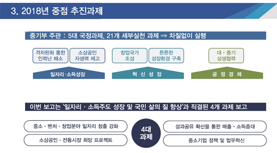 [일간환경연합 장민주 기자]중소벤처기업부는 18일 열린 이낙연 국무총리 주재 정부업무보고에서 “2018년에는 중소기업 정책을 일자리 중심으로 전면 개편하고, 성과공유 확산 등을 통해 일자리·소득을 늘리는데 주력한다”고 밝히면서 4개 핵심 과제를 보고했다.