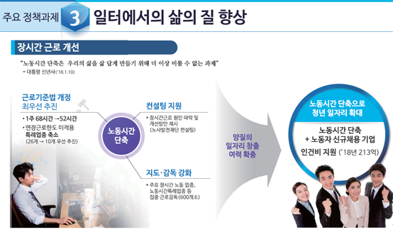 장시간 근로 업종에 대한 근로감독 강화(1만 8600개소), 재정지원을 통해 근로시간단축과 청년 신규채용을 연계해 나갈 계획이다.