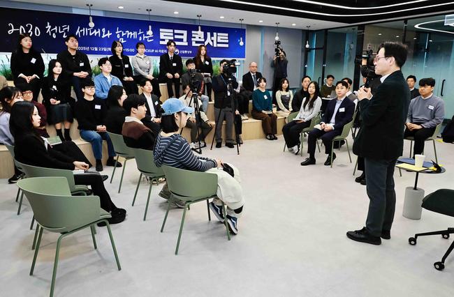 [일간환경연합 신상미 기자] 산업통상부는 12월 23일 서울 구로디지털단지 지타워에서 김정관 장관이 2030 청년 31명과 함께 ‘취업과 창업, 산업의 미래’를 주제로 토크콘서트를 열고 AI 시대 일자리와 산업 전망에 대한 청년들의 질문에 직접 답했다고 밝혔다.