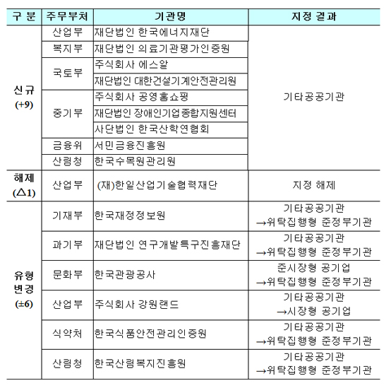 기타 공공기관이던 주식회사 강원랜드가 공기업으로, 재단법인 연구개발특구진흥재단·한국재정정보원·한국산림복지진흥원·한국식품안전관리인증원이 준정부기관으로, 공기업이던 한국관광공사가 준정부기관으로 변경됐다.