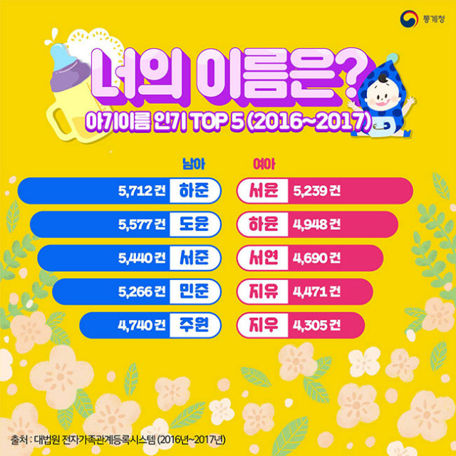 법원 가족관계등록 통계정보에 따르면 2016년~2017년도 출생 신고한 이름 중 가장 인기 있는 남자 이름은 하준(5,712건), 여자 이름은 서윤(5,236건)입니다.
