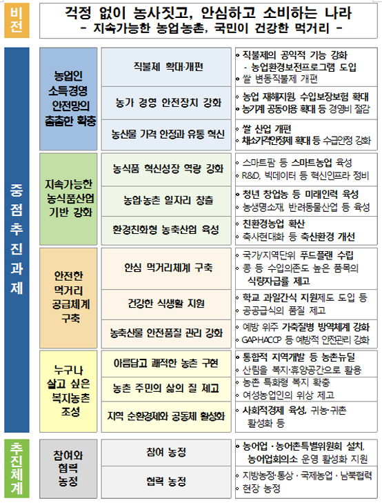 농식품부는 문재인정부 농정의 3대 핵심 축(농업·환경·먹거리)을 토대로 5대 정책과제, 14개 중과제 및 40개 세부과제를 선정했다.