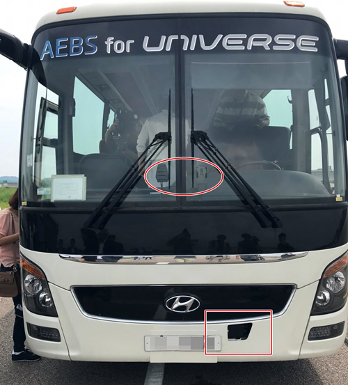 지난해 경기도 화성시 교통안전공단 자동차안전연구원에서 진행한 ‘버스 첨단안전장치 기능 시연회’에 참여한 버스. 이 버스에는 자동비상제동장치(AEBS), 차로이탈경고장치(LDWS), 전방충돌경고장치(FCWS)에 사용되는 레이더센서(붉은색 원)와 비전센서(붉은색 네모)가 달려있다.(사진=(c) 연합뉴스)