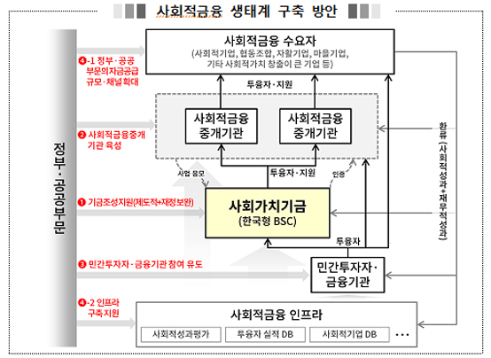 정부는 이런 문제를 해결하고자 우선 사회가치기금(Social Benefit Fund, 한국형 BSC)을 설립하기로 했는데 민간 자율적으로 사회적금융 수요에 맞게 출자·대출·출연 등 다양한 사업을 탄력적으로 수행할 수 있는 민간기금 설립을 추진한다.