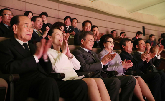 문재인 대통령이 지난 11일 서울 중구 국립중앙극장에서 북한 김정은 국무위원장 특사 자격으로 방한한 김여정 중앙위원회 제1부부장, 김영남 최고인민회의 상임위원장과 함께 삼지연 관현악단을 비롯한 북한 예술단의 공연을 관람하고 있다. (사진=청와대) |