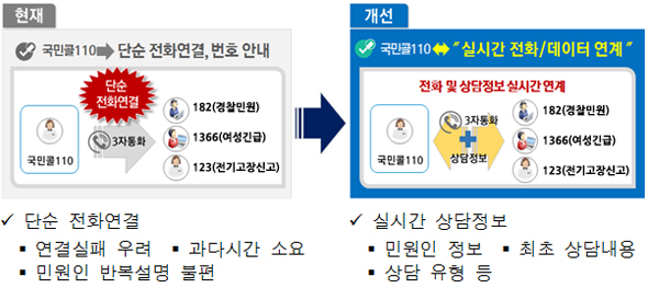 권익위는 우선 여성긴급·경찰민원·전기고장신고 시스템을 실시간으로 연결했으며 추후 나머지 13개 비긴급 신고상담 전화와의 연계도 단계적으로 확대할 방침이다.