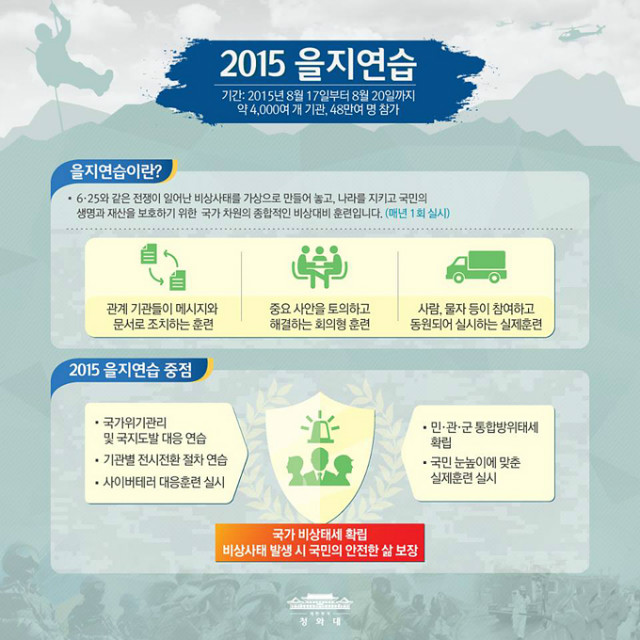 [일간환경연합 장민주 기자]‘2015 을지연습’이 8월 17일부터 20일까지 실시됩니다.